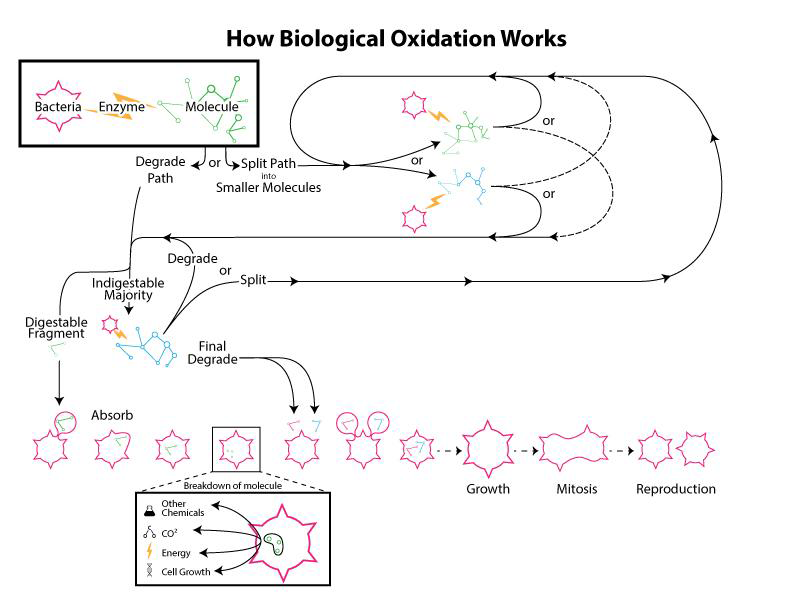 In the simplest terms, a biofilter is a device that utilizes natural biological oxidation for the destruction and / or removal of hydrocarbons (or CS2, H2S, NH3), that is to say biofiltration is the degradation of organic and inorganic substances by micro-organisms. These micro-organisms live in a biofilm coating that resides on the surface of a media composed of organic or inorganic (or a combination thereof) matter. The micro-organisms are for the stationary in regard to the system as a whole though they are mobile in their localized biofilm area. The process gases containing the contaminants to be treated flow through the media and as these gases flow by molecules of contaminants pass very near to or directly contact the biofilm where they are absorbed into the biofilm. Noting that the biofilm is primarily composed of water one can see clearly that a compounds solubility in water will greatly impact ease of degradation because if the compound does not enter the biofilm then it cannot be decomposed by the micro-organisms in that biofilm. The biofilm also creates a fixed (more or less) inhabitable space that can only be utilized by a finite maximum number of organisms. The organisms will grow and expand until the available space (biofilm) is filled resulting in situation where no more effective growth can occur.. This means that the effective amount of the summation of biomass (dead and alive) in the unit is at a relative constant. An example of this is shown in the graph below.